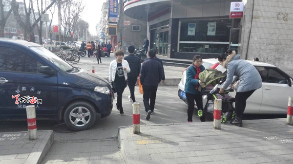 天天天水網(wǎng)2月14日訊 (記者王雪梅)2月14日,記者在秦州區(qū)解放路一路口看到,一輛七座面包車擋住了行人通道,一對母女不得不抬著嬰兒車繞行。記者發(fā)現(xiàn),解放路有不少街口都停滿了車輛,嚴重影響行人經(jīng)過,途經(jīng)市民都表示很無奈。記者在這里提醒廣大車主,這種隨便停車的行為雖然給了自己方便,但是卻給路人帶來了諸多不便,出行在外要約束自己,規(guī)范停車。