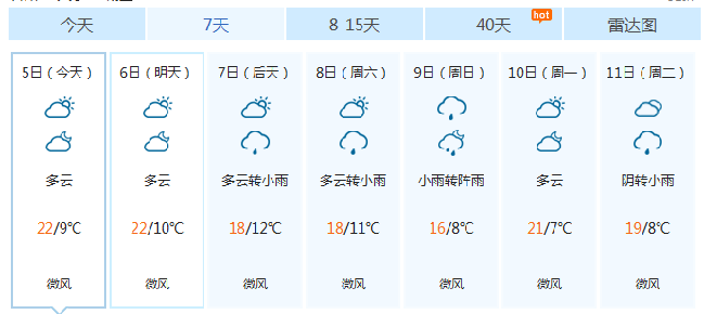 據(jù)市氣象臺預報,預計5~6日多云,7日陰轉陣雨,8~9日陰有小雨,10日陰轉多云。市區(qū)日最低氣溫8℃~12℃,日最高氣溫15℃~22℃,日平均氣溫12℃~16℃。