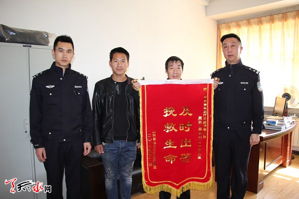 ????由于處置及時,為傷者爭取了最佳治療時間,目前,傷者任某已脫離危險,在天水市二院住院治療。住院期間,當(dāng)事人家屬曾多次打電話感謝民警的救命之恩,一直心懷感恩,遂制作一面“及時出警,挽救生命”的錦旗致謝民警。