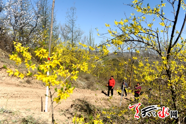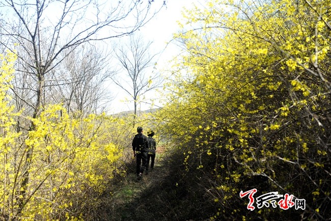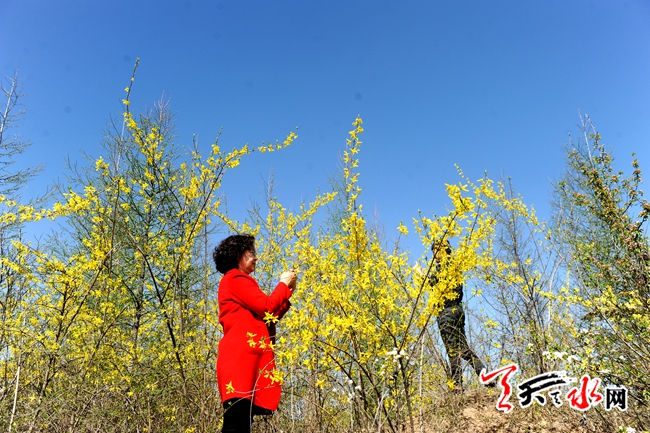 天天天水網(wǎng)18日17時(shí)訊【記者 楊曉斌】4月18日,在連翹旅游節(jié)到來之前,趕早觀花的游客已經(jīng)不斷向連翹花的主觀花地秦嶺鎮(zhèn)石家河村走來踏青賞花。時(shí)下,秦嶺鎮(zhèn)以石家河為中心的萬畝連翹花已經(jīng)全部綻放,并即將進(jìn)入盛花期。