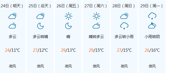 據(jù)市氣象臺預(yù)報,預(yù)計23~25日多云,26日雷陣雨轉(zhuǎn)多云,27~28日晴間多云。市區(qū)日最低氣溫10℃~15℃,日最高氣溫22℃~29℃,日平均氣溫17℃~22℃。