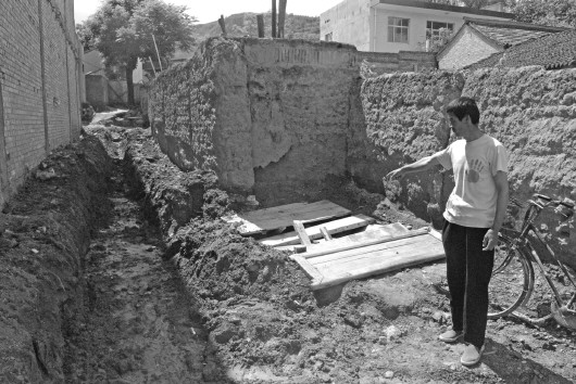 反映人王三旭告訴記者,他家以前的老院子因為2008年地震,成了危房,故在保留原來院墻的基礎(chǔ)上將房屋全部拆除,并將院子變成了現(xiàn)在的菜園子。記者對院前屋后進行了查看后發(fā)現(xiàn),以前的老院(現(xiàn)在的菜園子)和現(xiàn)在王先生居住的新院連在一起,在以前老院的東南角,被院墻圍堵后有一塊面積約10平米左右的缺角圈在墻外,現(xiàn)在被深挖硬化,成了王三旭家鄰居家的化糞池。老院正南面,隔一條巷道,就是其鄰居家正在修建的二層小樓房。