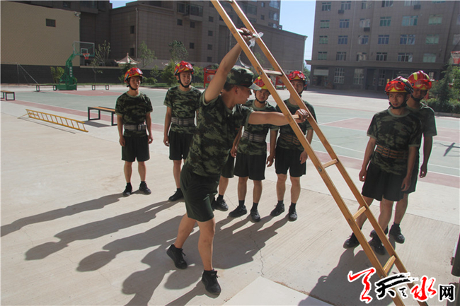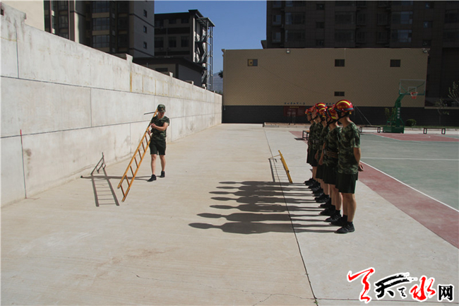 ????天天天水網(wǎng)訊 為進(jìn)一步提高官兵的業(yè)務(wù)技能水平,切實(shí)增強(qiáng)官兵的滅火救援能力。6月26日,甘谷中隊(duì)組織全體官兵開展掛鉤梯訓(xùn)練。?