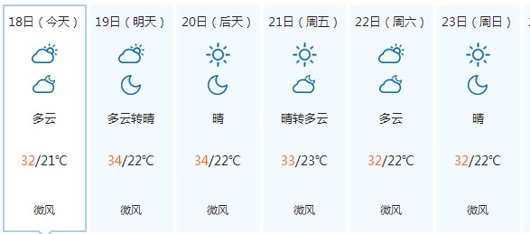 據(jù)市氣象臺預(yù)報,預(yù)計18日多云,19日多云轉(zhuǎn)晴,20~22日晴間多云、23日多云。市區(qū)日最低氣溫20℃~22℃,日最高氣溫29℃~34℃,日平均氣溫25℃~28℃。