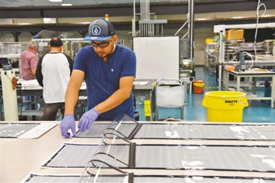 ????美國(guó)加州硅谷,米亞索能車間里的研發(fā)人員正在對(duì)薄膜太陽(yáng)能電池芯片進(jìn)行檢測(cè)安裝。