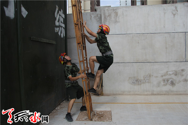 ????甘谷中隊積極開展雙人攀登六米拉梯操訓練