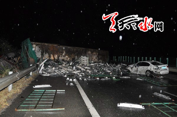 ????天天天水網(wǎng)訊【通訊員 成玉嬌】2017年7月27日19時50分許,玉泉高速公路大隊接過路司機報警稱:連霍高速(G30)由西向東方向1401公里處發(fā)生交通事故,一輛半掛車與一輛“寶馬”牌轎車刮擦相撞后側(cè)翻。接警后,副大隊長任明和逯彥曉帶領值班民警迅速趕赴現(xiàn)場,對事故現(xiàn)場進行安全防護與勘查。