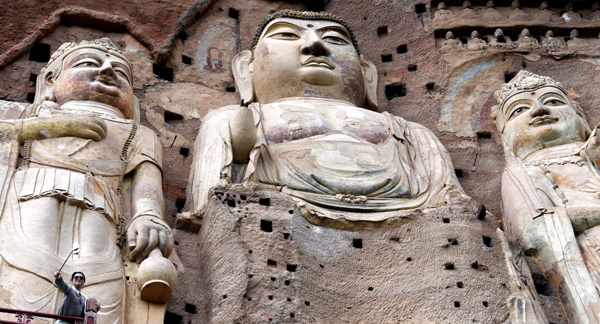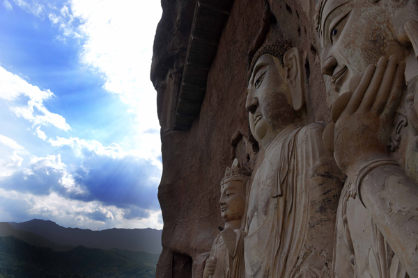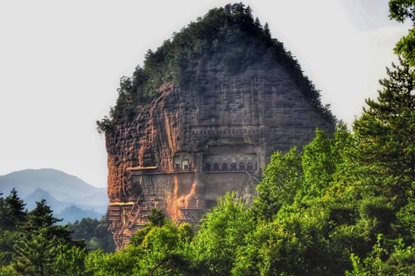 在秦嶺山脈西段的小隴山林海深處,一座孤峰突起、猶如農(nóng)家麥垛的奇峰巍然屹立,這就是麥積山。麥積山石窟始建于1600多年前的十六國后秦,洞窟“密如蜂房”,棧道“凌空飛架”,其驚險(xiǎn)陡峻為世罕見,形成了一個(gè)宏偉壯觀的立體建筑群,現(xiàn)存的194個(gè)窟龕、7000多件泥塑與石刻成就了“東方雕塑藝術(shù)館”的千秋盛名。峭壁之間鐫石成佛,凌空棧道迂回盤旋,行走在麥積山懸崖之上,腳下是藍(lán)天白云,眼前是石窟壁畫,萬龕千窟接通了佛國與塵世,仿佛穿越了歷史。