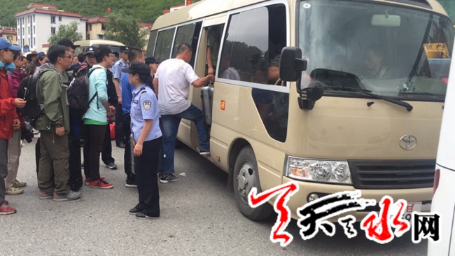8月9日下午記者了解到,15時(shí)許,九寨溝風(fēng)景區(qū)內(nèi)下著小雨,許多游客有序乘坐天水消防支隊(duì)的運(yùn)兵車撤離景區(qū)。