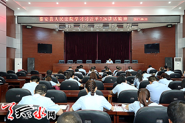 ????天天天水網(wǎng)訊(通訊員 李敏)2017年8月11日上午,秦安縣人民法院召開(kāi)全院干警大會(huì),貫徹學(xué)習(xí)習(xí)近平總書(shū)記7月26日在省部級(jí)主要領(lǐng)導(dǎo)干部專題研討班開(kāi)班式上的重要講話精神。大會(huì)由院黨組副書(shū)記、副院長(zhǎng)安志遠(yuǎn)主持。