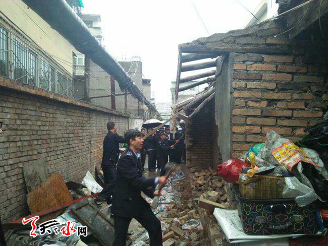 ????秦州區(qū)執(zhí)法局機(jī)動(dòng)二分隊(duì)拆除占用消防通道違建