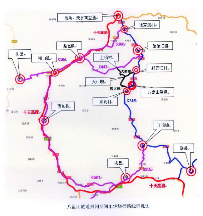 ????(1)經G7011十天高速公路繞行至成縣府城,接G8513成武高速公路可行至隴南市各縣區(qū);