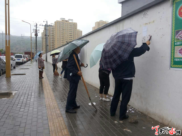 ????街道通過各社區(qū)板報、LED顯示屏、櫥窗等大力宣傳并組織人員對瀛池路、蓮亭路、赤峪路、紅山路、精表路等城區(qū)主干道、沿街商鋪、沿路電線桿、車站廣告牌、居民小區(qū)、背街小巷、樓道、溝渠內(nèi)等影響市容市貌、小區(qū)環(huán)境衛(wèi)生的牛皮癬小廣告進行了集中清理清除活動,有力擴大了活動的覆蓋面,增強了全民參與全域無垃圾環(huán)境保護的積極性和主動性。街道把全域無垃圾創(chuàng)建活動與全面落實河長制工作結(jié)合起來,以秦州區(qū)“十個結(jié)合、十個解決”為指導,徹底改善城鄉(xiāng)環(huán)境衛(wèi)生面貌,更進一步增強了轄區(qū)居民群眾的環(huán)保意識,在街道上下形成全民參與創(chuàng)建全域無垃圾工作的良好氛圍。