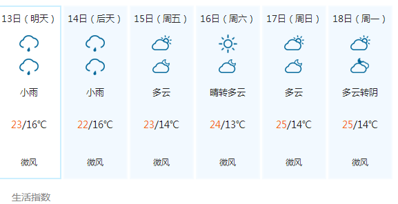 具體來看:12日,晴轉(zhuǎn)多云;13日,多云轉(zhuǎn)小雨;14日,小雨;15日,小雨轉(zhuǎn)多云;16日-17日,多云。氣溫預(yù)報以秦州區(qū)為例:日最低氣溫12℃-16℃,日最高氣溫22℃-28℃,日平均氣溫18℃-20℃。