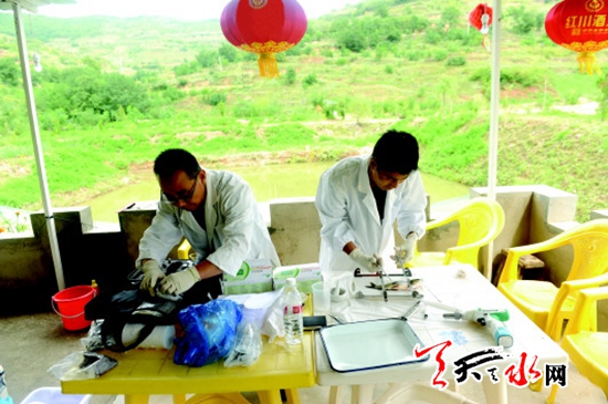 ???? 9月11日,市漁政監(jiān)督管理站的執(zhí)法人員在秦州區(qū)皂郊鎮(zhèn)馬家河漁場(chǎng)對(duì)養(yǎng)殖魚類進(jìn)行抽檢。