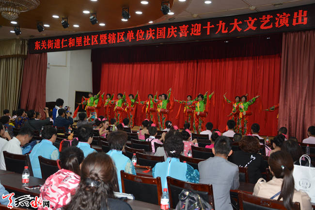 ????天天天水網(wǎng)訊【記者蔚軍平】9月26日下午,秦州區(qū)東關街道仁和里社區(qū)舉辦了“慶國慶喜迎十九大”文藝演出,社區(qū)干部、居民代表以及轄區(qū)單位的演員們歡聚一堂載歌載舞慶祝建國68周年,喜迎黨的“十九大”即將召開。