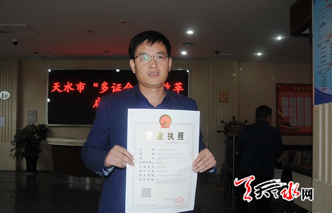 (2017年9月26日上午,天水市啟動“多證合一”改革,并頒發(fā)了全市首張“多證合一”營業(yè)執(zhí)照。資料圖)