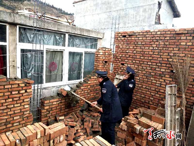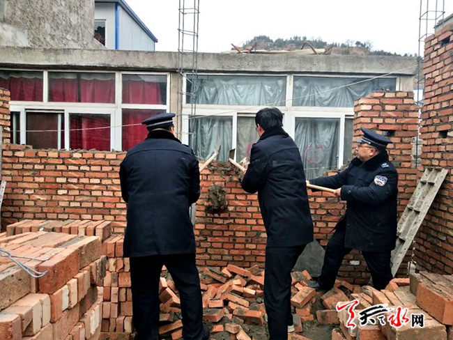 ??? 天天天水網(wǎng)訊【通訊員 趙懿】11月29日上午,秦州區(qū)執(zhí)法局執(zhí)法人員對羅玉路居民新村李某的一處違法建筑進(jìn)行了強(qiáng)制拆除。