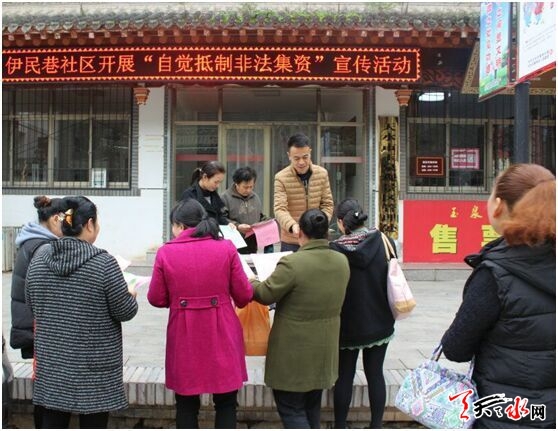 ???? ?天天天水網(wǎng)訊(通訊員 任秀娟)為進一步防范、打擊非法集資活動,切實維護轄區(qū)居民的切身利益,12月1日,伊民巷社區(qū)開展了“自覺抵制非法集資”為主題的非法集資宣傳活動。