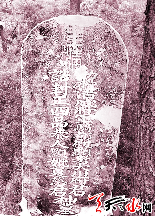 ????該石碑引首圖案及文字為陰刻雙龍,左右環(huán)繞“皇清”二字。石碑引首豎行小字:“乾隆四十口口口口口壬寅仲春之吉,府口口口口口亭大川庚午科中式武魁”。石碑正面中間豎行大字為并列:“左勅授清威將軍騎都尉顯考大川府君;右誥封正四品恭人顯妣夏慈君,神墓”,石碑落款小字為“男靳楷孫逢泰仝敬立石”