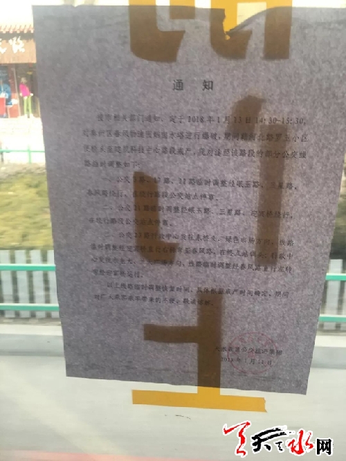 天天天水網(wǎng)訊 1月11日天水羲通公交旅游集團在公交站及公交車內(nèi)發(fā)布公告,由于1月13日14:30-15:30對秦州區(qū)春風(fēng)物流園煙囪水塔爆破,爆破期間藉河北路羅玉小區(qū)便橋頭至建筑科技中心路段戒嚴(yán),經(jīng)該路段的3路、17路、21路、22路、23路公交車部分線路將調(diào)整。
