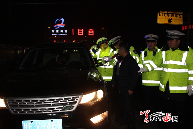 天天天水網(wǎng)訊(通訊員 姚宏博)甘肅省公安廳決定,自2018年1月1日至4月10日,在全省范圍內開展整治酒駕醉駕百日行動。1月9日夜間,天水市公安局交警支隊新興高速公路大隊根據(jù)上級公安機關的要求部署,在轄區(qū)甘谷收費站設置執(zhí)勤點開展夜查統(tǒng)一行動,確保交通安全,重點查處酒后駕駛機動車違法行為。