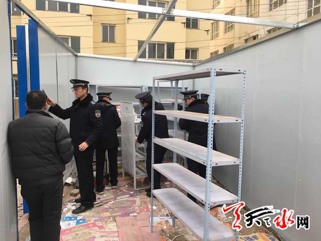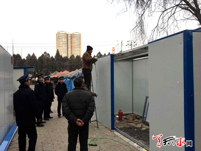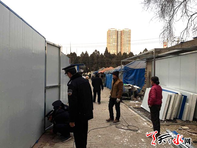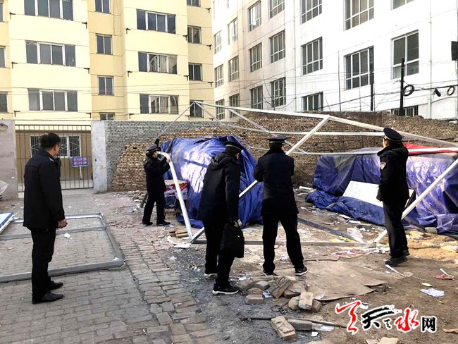 ????2018年1月20日,秦州區(qū)執(zhí)法局機動二中隊隊員巡查至石馬坪時發(fā)現(xiàn),石馬坪中學東側(cè)菜市場內(nèi)有三處違章搭建的活動板房,立即詢問當事人是否辦理審批手續(xù),進行了相關(guān)法律法規(guī)的宣傳,并告知其建筑未辦理審批手續(xù)擅自建設(shè)屬違規(guī)建筑,需進行拆除。中隊堅持“先說服自拆,后采取強制”的原則。在執(zhí)法人員的協(xié)助下,及時平穩(wěn)的拆除了三處違章搭建,共計100多平米,做好了控建、拆違工作的落實。