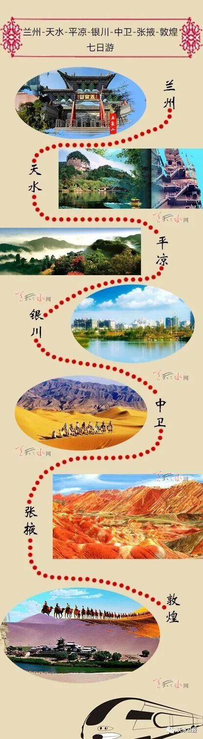 ??? 蘭州-天水-平?jīng)?銀川-中衛(wèi)-張掖-敦煌七日游,以蘭州、天水為游客集散中心,面向?qū)毺m高鐵等游客,涵蓋甘、寧境內(nèi)最精華旅游名勝,是一條極具誘惑力的大環(huán)線旅游線路。