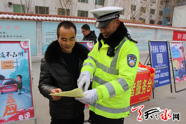 天天天水網(wǎng)訊(通訊員 姚宏博)為營(yíng)造安全、暢通、文明、和諧的春運(yùn)道路交通環(huán)境,2月1日上午,天水市公安局交警支隊(duì)新興高速公路大隊(duì)舉行了2018年“平安春運(yùn)?交警同行”主題宣傳活動(dòng)。