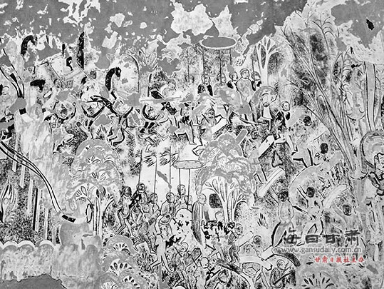 ????據(jù)了解,此次麥積山石窟參展的藝術(shù)作品中,《涅槃經(jīng)變》系楊曉東先生耗時3年時間臨摹完成,且首次參加國內(nèi)外展出。這幅藝術(shù)品長近10米,高2米,由400多個人物形象組成。
