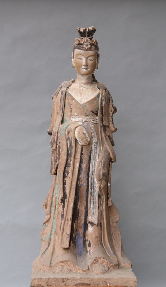 ????塑像位于窟正壁左側(cè)。頭戴花蔓高冠,面型飽滿豐潤,彎眉細(xì)目,直鼻,薄唇,嘴角內(nèi)斂。著低胸交領(lǐng)束腰長衫,寶繒自雙肩分披下垂。左臂屈肘自然下垂,右手持貼于腹前。身軀窈窕、委婉多姿,服飾層次清晰、厚重富于質(zhì)感,華麗的服飾體現(xiàn)了其身份的高貴,沉思下的雙眼,含笑的神態(tài),深刻地塑造出菩薩女性般的溫柔與恬靜,給人以高雅、豁達(dá)之感。為西魏菩薩代表之作。