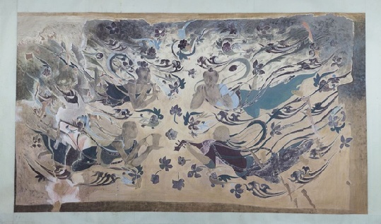 ????繪于窟龕上方,大型飛天七幅之一。畫面兩組飛天,相向而飛,有的手執(zhí)樂器演奏,有的手捧供物飛舞,自由自在地飛旋于鮮花與祥云的虛空之中,一幅歡快祥和的動人場面。別出心裁,獨具一格的表現(xiàn)形式不僅輕盈優(yōu)美,增加了人物的流動感,也體現(xiàn)了作者卓越的智慧與豐富的想象力。天人的臉部和肌體部分均為薄薄一層優(yōu)質(zhì)細(xì)泥塑出,其他如衣著、飄帶、飾物及周圍的流云、花飾等,均彩繪而成。將立體雕塑和平面繪畫珠聯(lián)璧合地結(jié)合在一起,創(chuàng)造性地繪制出了“薄肉塑”飛天壁畫,具有“呼之欲出”之感,在中國石窟壁畫中獨此一處,成為中國石窟壁畫中的經(jīng)典之作。