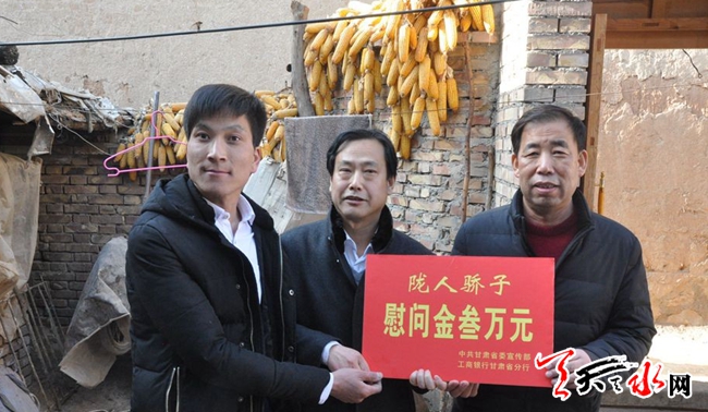 ? 天天天水網(wǎng)訊【記者閆波】2月12日,受省委宣傳部、工商銀行甘肅省分行委托,市委宣傳部、工商銀行天水分行相關(guān)負(fù)責(zé)人赴武山縣鴛鴦鎮(zhèn)盤古村,看望慰問“隴人驕子”包永弟,表達(dá)了新年的問候和祝福,轉(zhuǎn)達(dá)了黨和政府對(duì)“隴人驕子”的關(guān)心關(guān)愛,并送上了3萬元慰問金和米面油等生活用品。