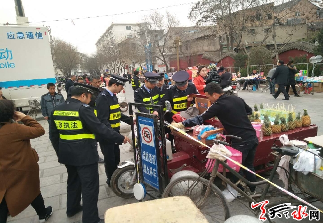 ????? 天天天水網(wǎng)訊?【通訊員 沈彥斌】戊戌年春祭伏羲盛典與市民朋友們?nèi)缂s而至,為確保祭祀盛典安全有序進(jìn)行,秦州區(qū)執(zhí)法局機(jī)動(dòng)中隊(duì)按照區(qū)委、區(qū)政府、局黨組統(tǒng)一部署,進(jìn)一步細(xì)化分工,針對(duì)祭祀期間出現(xiàn)的占道經(jīng)營(yíng)、店外經(jīng)營(yíng)和流動(dòng)攤販等情況,提前籌劃準(zhǔn)備,合理安排執(zhí)法力量,全面開(kāi)展執(zhí)法巡查和服務(wù)保障工作,為市民創(chuàng)造了整潔、干凈、安全、和諧的祭祀環(huán)境。