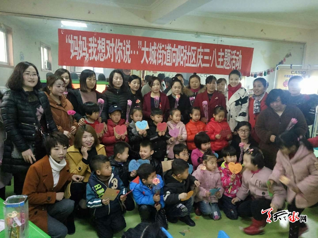 ????天天天水網(wǎng)訊(通訊員曹兵虎)3月7日上午,大城街道向陽(yáng)社區(qū)聯(lián)合轄區(qū)向陽(yáng)幼兒園舉辦了以“媽媽,我想對(duì)你說(shuō)...”為主題的慶三八感恩活動(dòng)。孩子們的親切問(wèn)好,精心準(zhǔn)備的小卡片和一束康乃馨,讓媽媽們?cè)趪?guó)際三八婦女節(jié)感受到了意外的驚喜和溫暖。