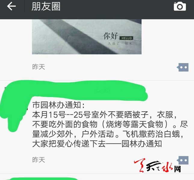 近日,朋友圈傳播著這樣一條“通知”,“市園林辦通知:本月15號--25號室外不要曬被子,衣服,不要吃外面的食物(燒烤等露天食物)。盡量減少郊外,戶外活動。飛機撒藥治白蛾,大家把愛心傳遞下去……”