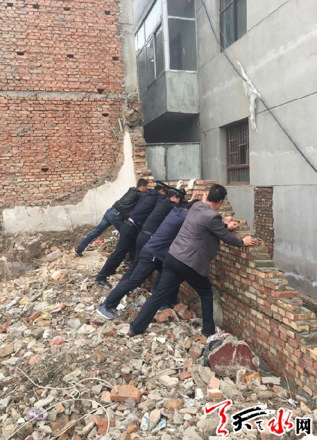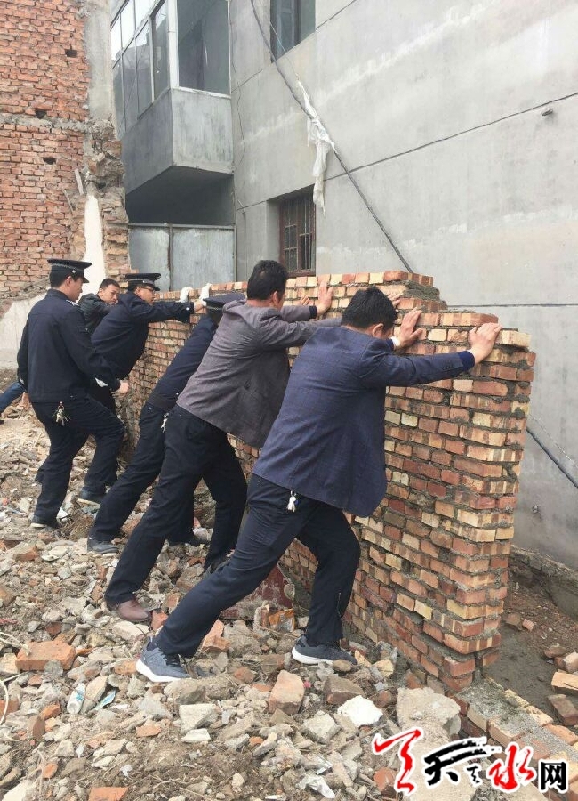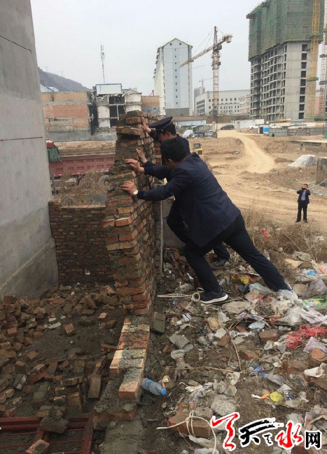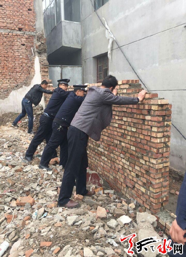 天天天水網(wǎng)訊【通訊員 沈彥斌】3月23日上午,由玉泉鎮(zhèn)鎮(zhèn)政府牽頭組織,區(qū)執(zhí)法局、國土資源局等部門聯(lián)合執(zhí)法,組織30余人依法強(qiáng)制拆除西團(tuán)莊村一處違章建筑。