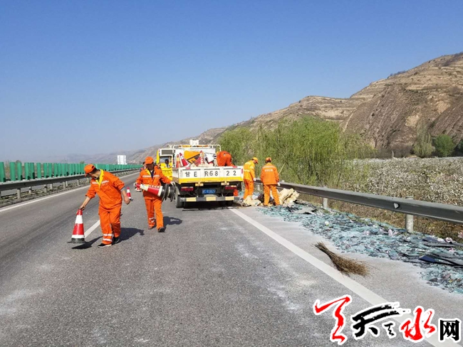 ??? 天天天水網(wǎng)(通訊員 胡澤庭)2018年4月3日早6時(shí),天水公路管理局高養(yǎng)中心武山養(yǎng)護(hù)工區(qū)在巡查時(shí),發(fā)現(xiàn)G30線連霍高速公路天定段上行線1401+700處,一輛拉運(yùn)玻璃半掛車和一輛拉運(yùn)食品材料半掛車發(fā)生刮擦碰撞事故,拉運(yùn)玻璃車玻璃灑落在超車道、行車道和應(yīng)急車道路面,灑落長(zhǎng)約200米,主要為破碎玻璃片和玻璃渣。天水公路管理局高養(yǎng)中心養(yǎng)護(hù)職工迅速擺放反光錐桶布設(shè)安全作業(yè)區(qū),安排四名養(yǎng)護(hù)職工配合高速交警做好后方車輛的安全示警工作。養(yǎng)護(hù)職工先將大塊玻璃裝車,清理出一條通道,讓后方排隊(duì)車輛緩慢謹(jǐn)慎通過。事故車輛被拖離現(xiàn)場(chǎng)后,立即全面清理路面碰撞灑落碎片等雜物,并做好交通疏導(dǎo),指揮車輛緩慢有序通過。