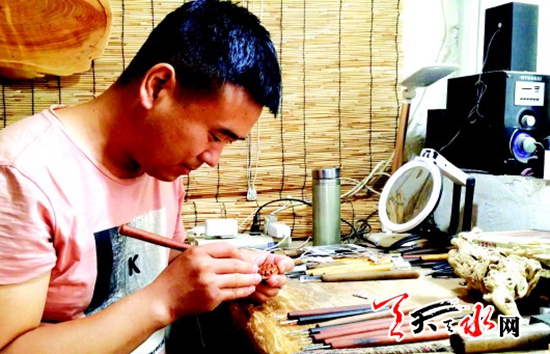 今年34歲的移衛(wèi)軍,是甘谷縣大像山鎮(zhèn)土堆村人,在從事桃核雕刻之前,他已經(jīng)從事木雕工作10多年了。正是從事木雕工作多年磨練出來的扎實功底,給他的桃核雕刻設(shè)計搭出了創(chuàng)造創(chuàng)新的新舞臺。