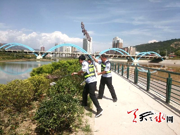 天水籍河風(fēng)情線是廣大市民休閑、娛樂(lè)的地方。為確保市民人生安全,維護(hù)籍河風(fēng)情線正常秩序,提升我市城市管理的良好的形象。針對(duì)近期籍河風(fēng)情線流浪犬較多,犬吠擾民等現(xiàn)象,加之越來(lái)越多的流浪犬聚集在湖邊、橋頭、花草樹(shù)叢中,給過(guò)往行人造成一定安全隱患,危害市民出行安全,在破壞城市環(huán)境衛(wèi)生的同時(shí),嚴(yán)重影響了我市文明形象。為此,七里墩中隊(duì)抽調(diào)人員,對(duì)天水籍河風(fēng)情線的流浪犬進(jìn)行集中捕捉。