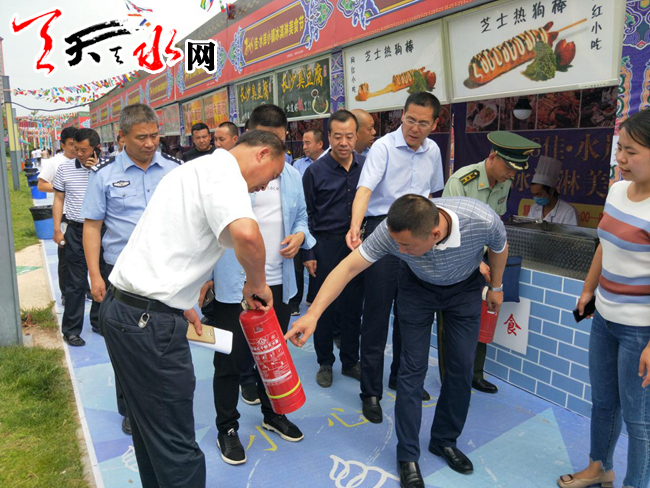 王曉彤一行首先來(lái)到佳·水岸小鎮(zhèn)美食廣場(chǎng),詳細(xì)了解美食節(jié)期間食品安全保障工作的準(zhǔn)備情況,現(xiàn)場(chǎng)查看了消防設(shè)施和器材的完備情況;安全用電、用氣情況;疏散通道暢通情況;食品保質(zhì)期和衛(wèi)生情況等。王曉彤對(duì)檢查中存在的電線裸露、亂拉電纜、滅火器過(guò)期、食品保質(zhì)期等安全問(wèn)題和隱患提出整改意見(jiàn),要求業(yè)務(wù)部門(mén)發(fā)放整改通知書(shū),主辦方現(xiàn)場(chǎng)整改。王曉彤一行隨后來(lái)到第29屆中國(guó)天水伏羲文化旅游節(jié)非遺展示區(qū),就非遺戰(zhàn)區(qū)的安全生產(chǎn)進(jìn)行了檢查。
