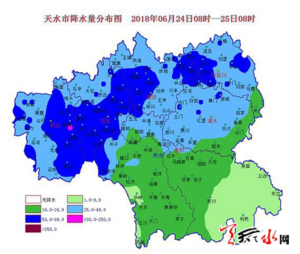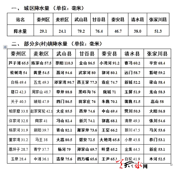 天天天水網(wǎng)訊 受冷空氣和西南暖濕氣流影響,24日凌晨開始,我市出現(xiàn)大范圍暴雨天氣,全市共有97個雨量點(diǎn)出現(xiàn)暴雨(≥50毫米),最大降水量出現(xiàn)在武山縣洛門鎮(zhèn)蓼陽,達(dá)110.3毫米。24日08時至25日08時降雨量統(tǒng)計(jì)如下: