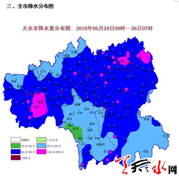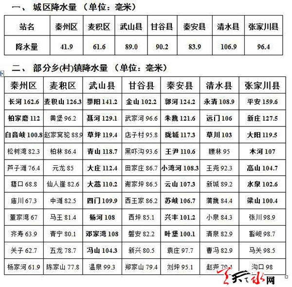 天天天水網(wǎng)訊 受冷空氣和西南暖濕氣流影響,24日凌晨至25日夜間,我市出現(xiàn)大范圍暴雨天氣,全市共有197個雨量點出現(xiàn)暴雨(≥50毫米),其中35個監(jiān)測點雨量超過100毫米,最大降水量出現(xiàn)在秦州區(qū)娘娘壩鎮(zhèn)長河,達(dá)162.6毫米。24日00時至26日07時降雨量統(tǒng)計如下: