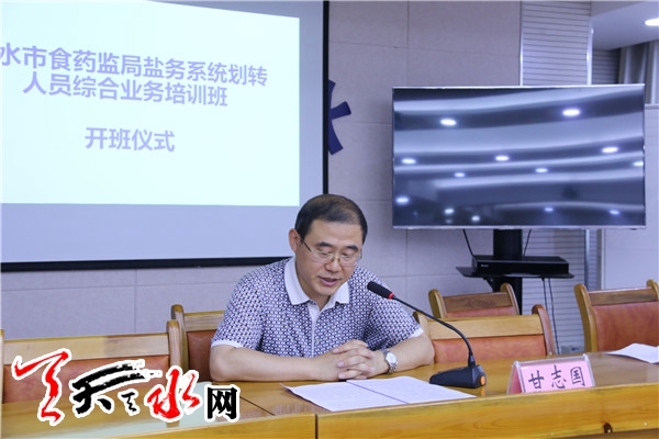 ????天天天水網(wǎng)訊 7月2日上午,市食品藥品監(jiān)督管理局組織的省鹽務系統(tǒng)劃轉(zhuǎn)人員食品藥品監(jiān)管綜合業(yè)務培訓班開班。市食藥監(jiān)局副局長甘志國在開班儀式上做動員講話。劃轉(zhuǎn)到市食品藥品監(jiān)督管理局工作的28名省鹽務局天水分局工作人員參加了培訓。此次培訓將為期一月時間。