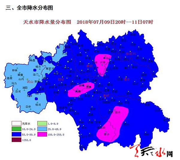 天天天水網(wǎng)訊 據(jù)天水氣象臺(tái)消息 10日凌晨開始,我市出現(xiàn)了大范圍暴雨天氣。截止11日07時(shí),全市共有101個(gè)鄉(xiāng)鎮(zhèn)出現(xiàn)暴雨(≥50毫米),7個(gè)鄉(xiāng)鎮(zhèn)出現(xiàn)大暴雨(≥100毫米),最大降水出現(xiàn)在秦安縣云山鎮(zhèn)李川,達(dá)110.0毫米。其中秦安縣云山、中山、興豐,秦州區(qū)娘娘壩及麥積區(qū)新陽、仙人崖、渭南等7個(gè)鄉(xiāng)鎮(zhèn)出現(xiàn)大暴雨。