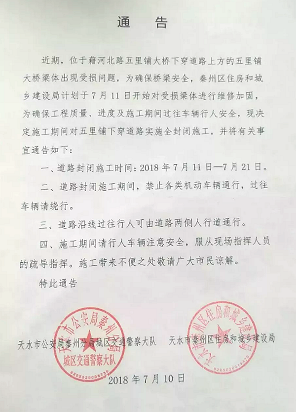 秦州區(qū)五里鋪橋11日施工維修,車輛行人請(qǐng)繞行!