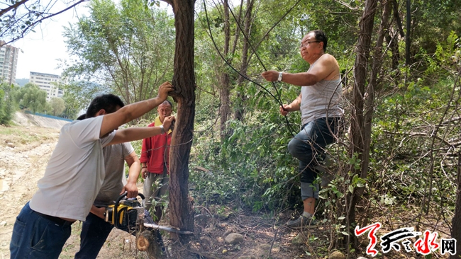 天水的天氣已是三伏天,酷熱難耐。志愿者有的用油鋸、有的用手鋸、有的用斧子砍伏樹木,伴隨著油鋸的馬達(dá)聲、斧子的砍伐聲,鋸末飛濺。志愿者揮汗如雨,汗水混合著鋸末,讓人睜不開眼睛,但是他們?nèi)徊活?,撩起衣襟,擦干汗水,咕咚咕咚喝一瓶水,接著繼續(xù)干。樹木被打成截,再系上繩索,拉到河岸上。