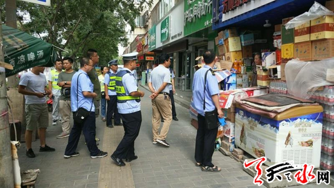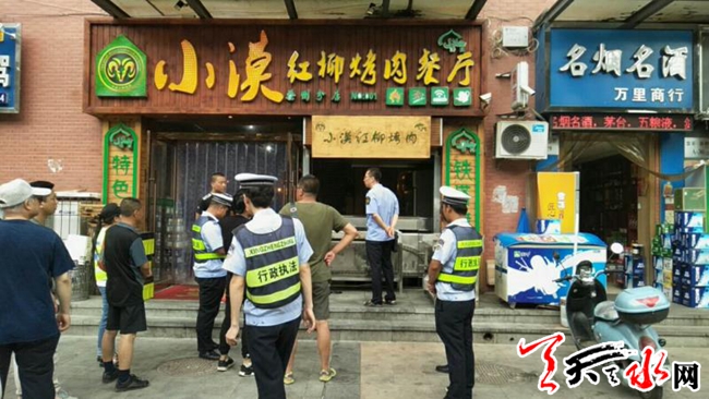 天天天水網(wǎng)訊【通信員 趙璇】7月23日,秦州區(qū)執(zhí)法局東關中隊聯(lián)合區(qū)食藥監(jiān)局、環(huán)衛(wèi)局及環(huán)保局,對羅玉小區(qū)周邊的燒烤店占道擺放桌椅、流動燒烤等影響市容環(huán)境和居民生活的露天燒烤行為進行集中整治。