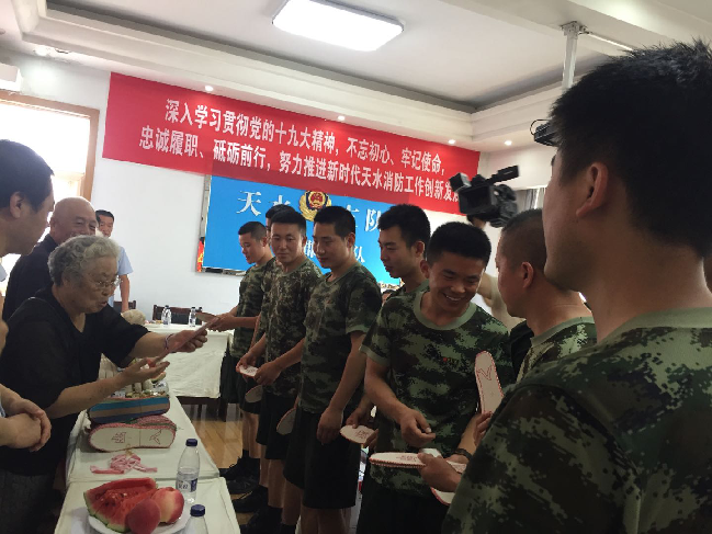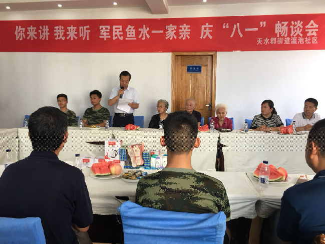 ????天天天水網(wǎng)訊 7月30日上午,天水郡街道瀛池社區(qū)組織轄區(qū)內(nèi)的參戰(zhàn)老兵、轉(zhuǎn)業(yè)退伍軍人、擁軍模范等來到天水郡消防中隊(duì)與消防官兵一起開展“你來講,我來聽,軍民魚水一家親”慶“八一”暢談會(huì)。參加此次暢談會(huì)的還有天水郡街道臧主任、趙主任、馬部長(zhǎng),社區(qū)全體干部。