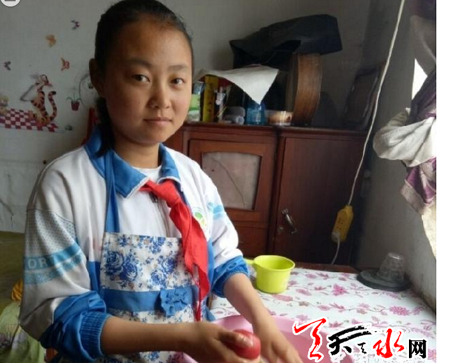 ????王文艷,女,17歲,漢族,天水市清水縣秦亭中學八年級學生。出生在清水縣秦亭鎮(zhèn)劉峽村柳南組一個貧困農(nóng)村家庭,父親于10年前因病逝世,母親在父親逝世后改嫁,當時只剩下年邁的爺爺和5歲的弟弟,爺爺就成了年幼的姐弟倆唯一的生活與精神支柱。不幸的是,2016年爺爺因病不幸離世,使這個不幸的家庭更加變得雪上加霜。從此,這個家現(xiàn)在就只剩下他和弟弟了。這些年,在親房鄰居、社會愛心人士的呵護下,在學校老師同學的幫助下,這個性格沉穩(wěn)、溫和善良的女孩,性格變得成熟,更加堅強。她熱愛祖國,熱愛集體;團結同學,樂于助人;勤奮好學,品學兼優(yōu),是一名全面發(fā)展、出類拔萃的優(yōu)秀中學生。